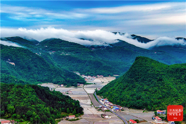 湖北省兴山县利用地方生态优势发展避暑康养和高山蔬菜,让山区农民找到了一条依靠青山资源发家致富的生态旅游路。图为该县榛子乡青山环抱、云雾缭绕、田园如画。(湖北省兴山县纪委监委 邓苗苗 摄)