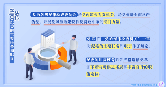 2021年,中共中央发布《中国共产党纪律检查委员会工作条例》,《条例》第三条规定,党的各级纪律检查委员会的主要任务是:维护党的章程和其他党内法规,检查党的理论和路线方针政策、党中央决策部署执行情况,协助党的委员会推进全面从严治党、加强党风建设和组织协调反腐败工作。《条例》第四章、第五章分别以专章的形式对党的各级纪律检查委员会的主要任务、工作职责作出具体规范。