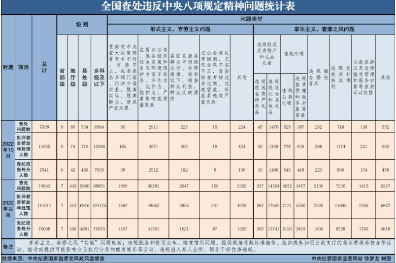 11月27日,中央纪委国家监委公布了2022年10月全国查处违反中央八项规定精神问题汇总情况。今年10月,全国共查处违反中央八项规定精神问题7558起,批评教育帮助和处理11050人,其中,党纪政务处分7541人,这是连续第110个月公布月报数据。