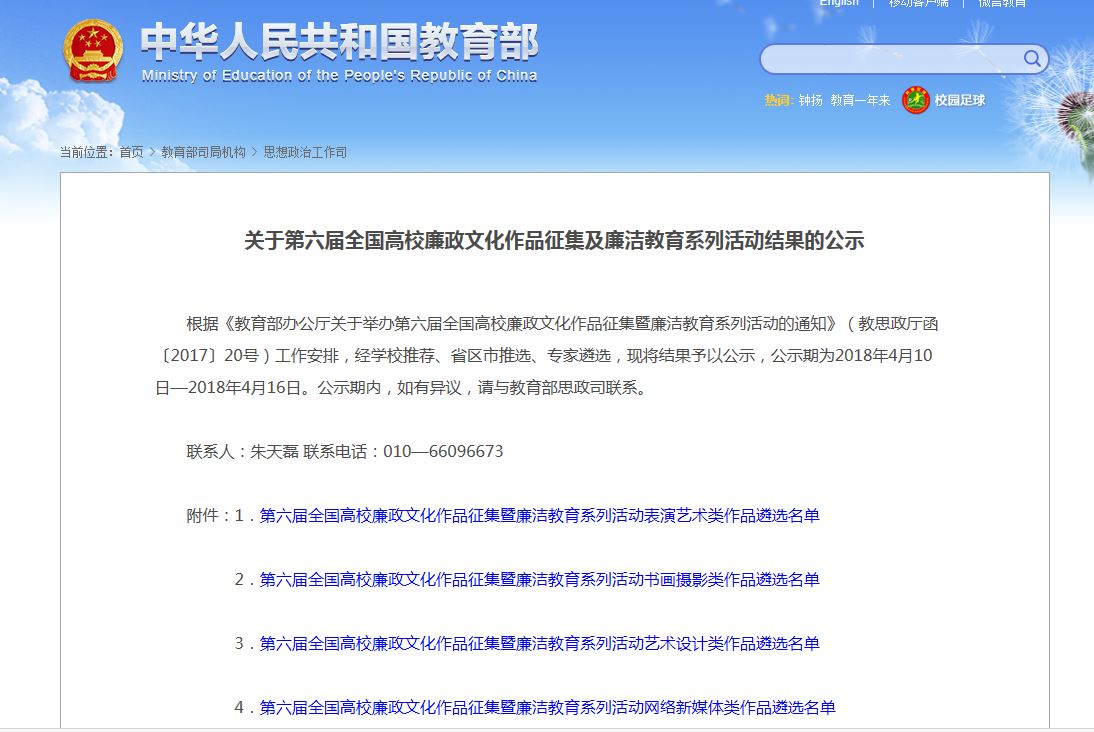 近日,由教育部思想政治工作司主办的第六届全国高校廉政文化作品征集活动评选结果揭晓,我院选送的两件作品获奖。